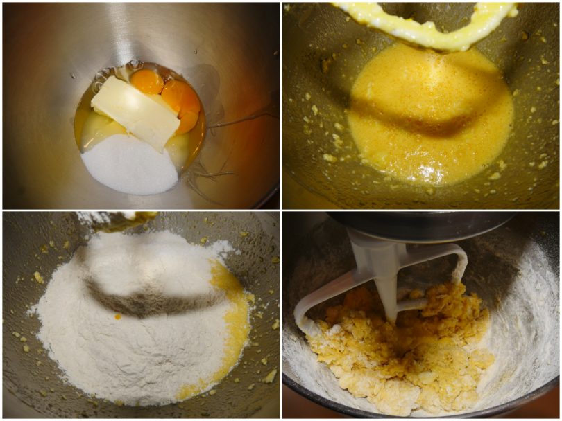 Innanzitutto preparate l'impasto: lavorate insieme burro, zucchero, vaniglia, sale e uova, quindi incorporate farina, fecola e lievito setacciati.
