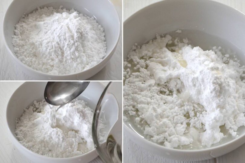 Preparate la ghiaccia: mettete lo zucchero in una ciotolina e aggiungete l'acqua tiepida, 1 cucchiaio per volta, mescolando bene: dovreste ottenere un composto denso ma fluido (se così non è, aggiungete un altro pochino di acqua o di zucchero a velo, a seconda della situazione, per renderla più fluida o più densa).