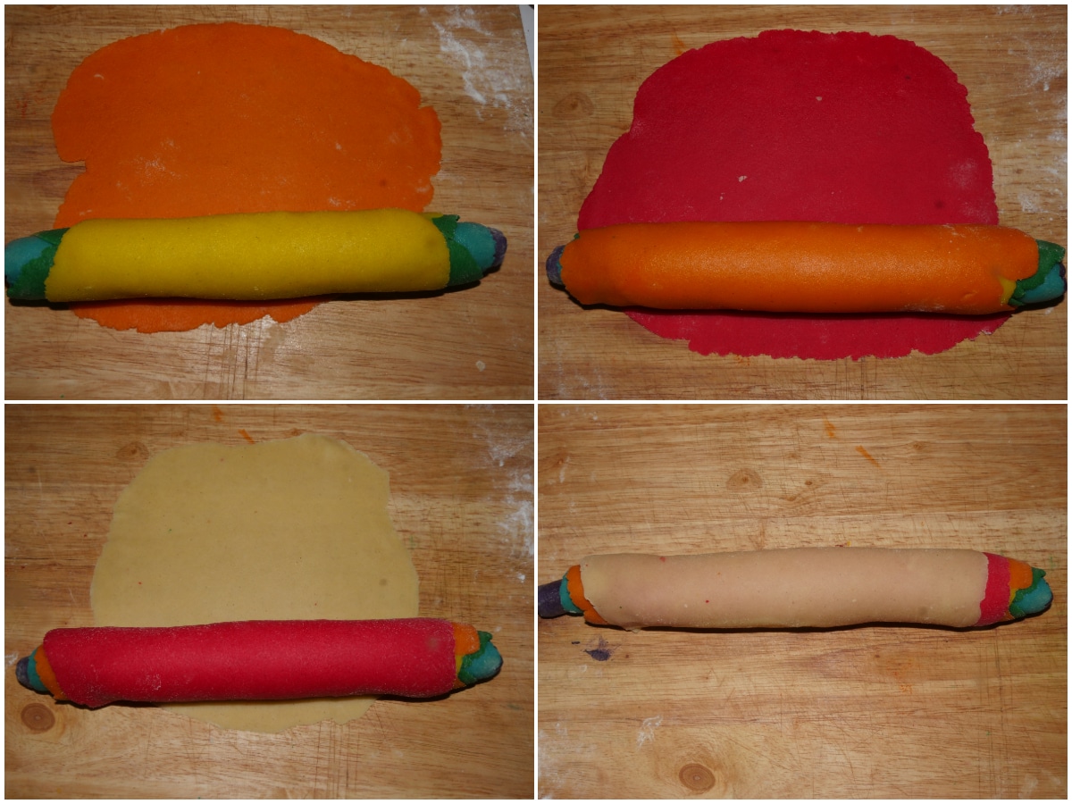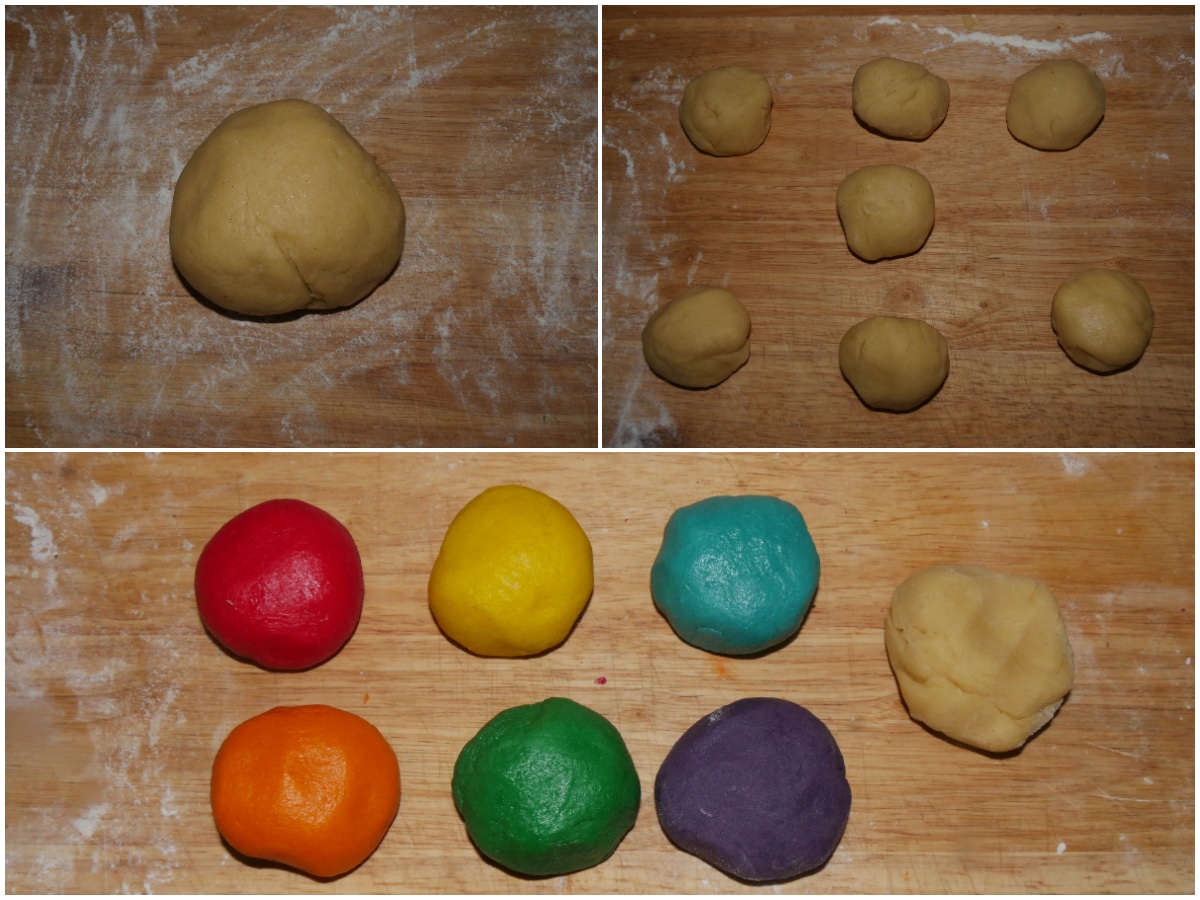 Riprendete l'impasto e dividetelo in 7 parti uguali: lasciatene una neutra e colorate le altre 6, rispettivamente di rosso, arancio, giallo, verde, azzurro e viola.