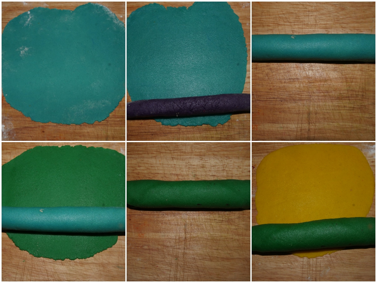 Avvolgete l'impasto azzurro intorno a quello viola, poi avvolgete quello verde intorno all'azzurro e il giallo sul verde.