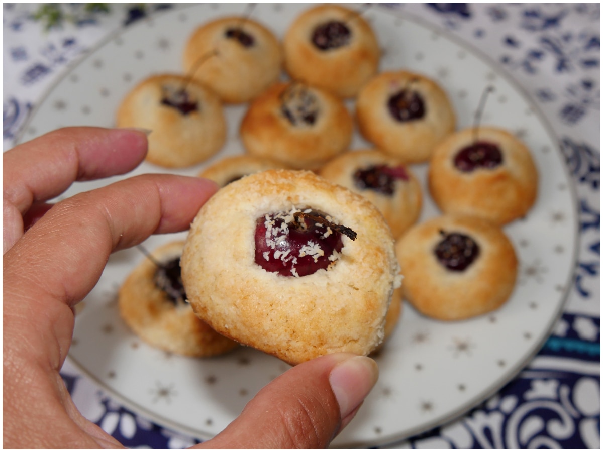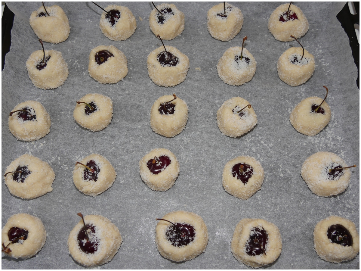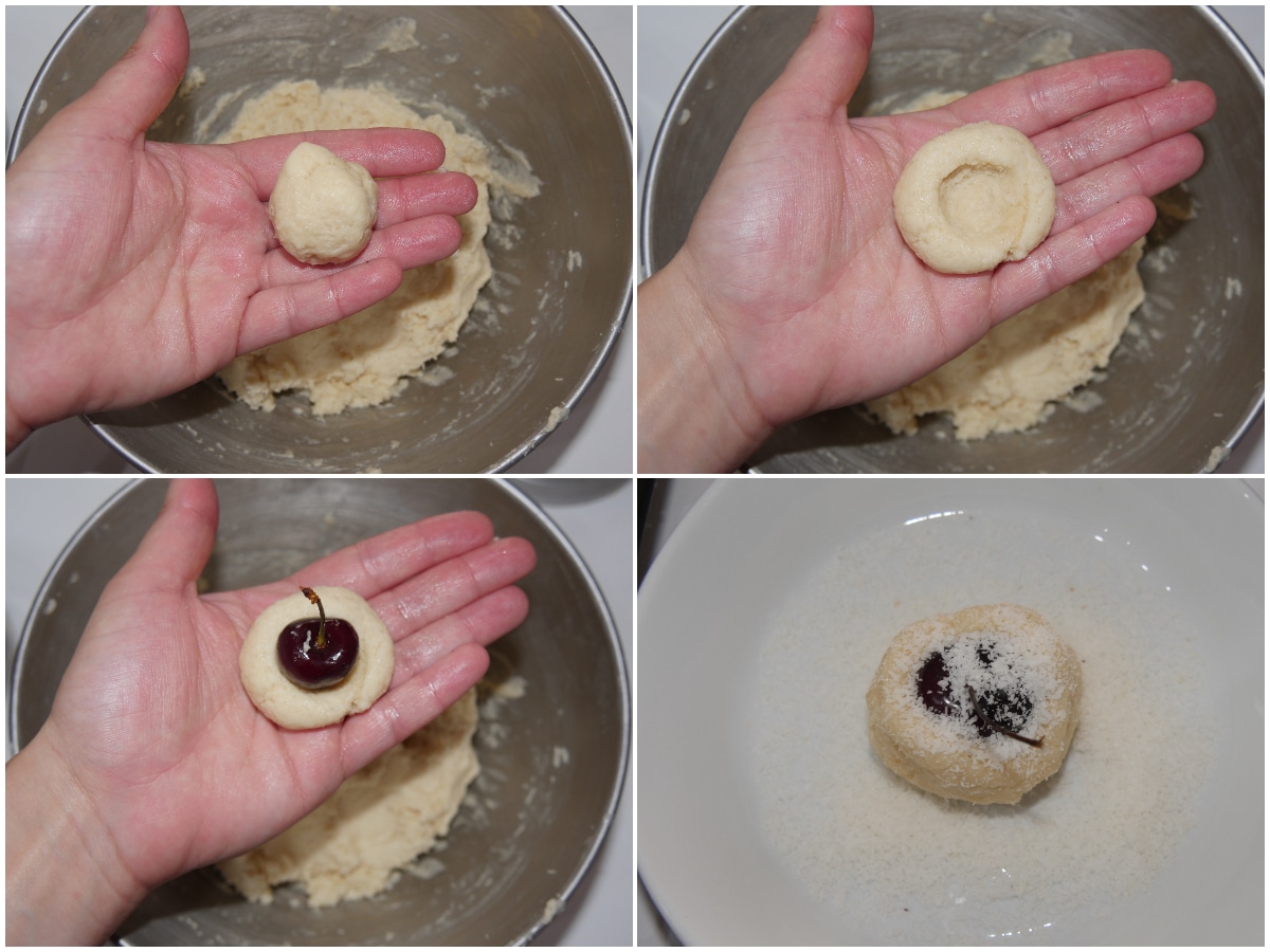 Richiudete la frolla attorno alla ciliegie, lasciando la parte intorno al picciolo a vista, e rotolate il biscotto nella farina di cocco, facendola aderire alla superficie.
