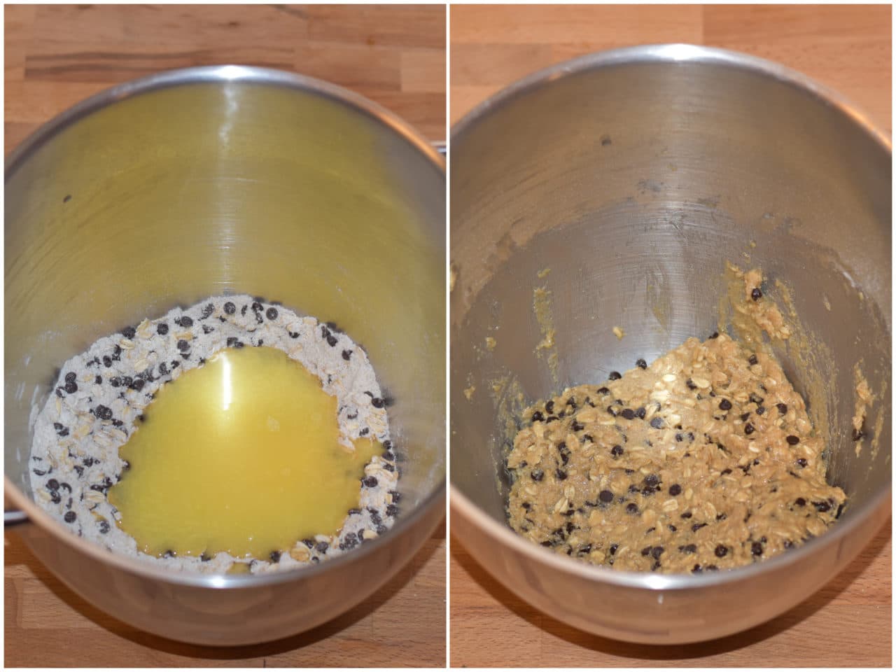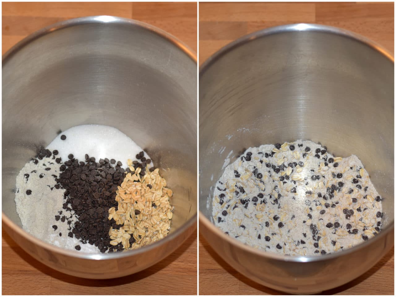 Unite in una ciotola farina, zucchero, fiocchi, lievito, sale e gocce di cioccolato e mescolate.