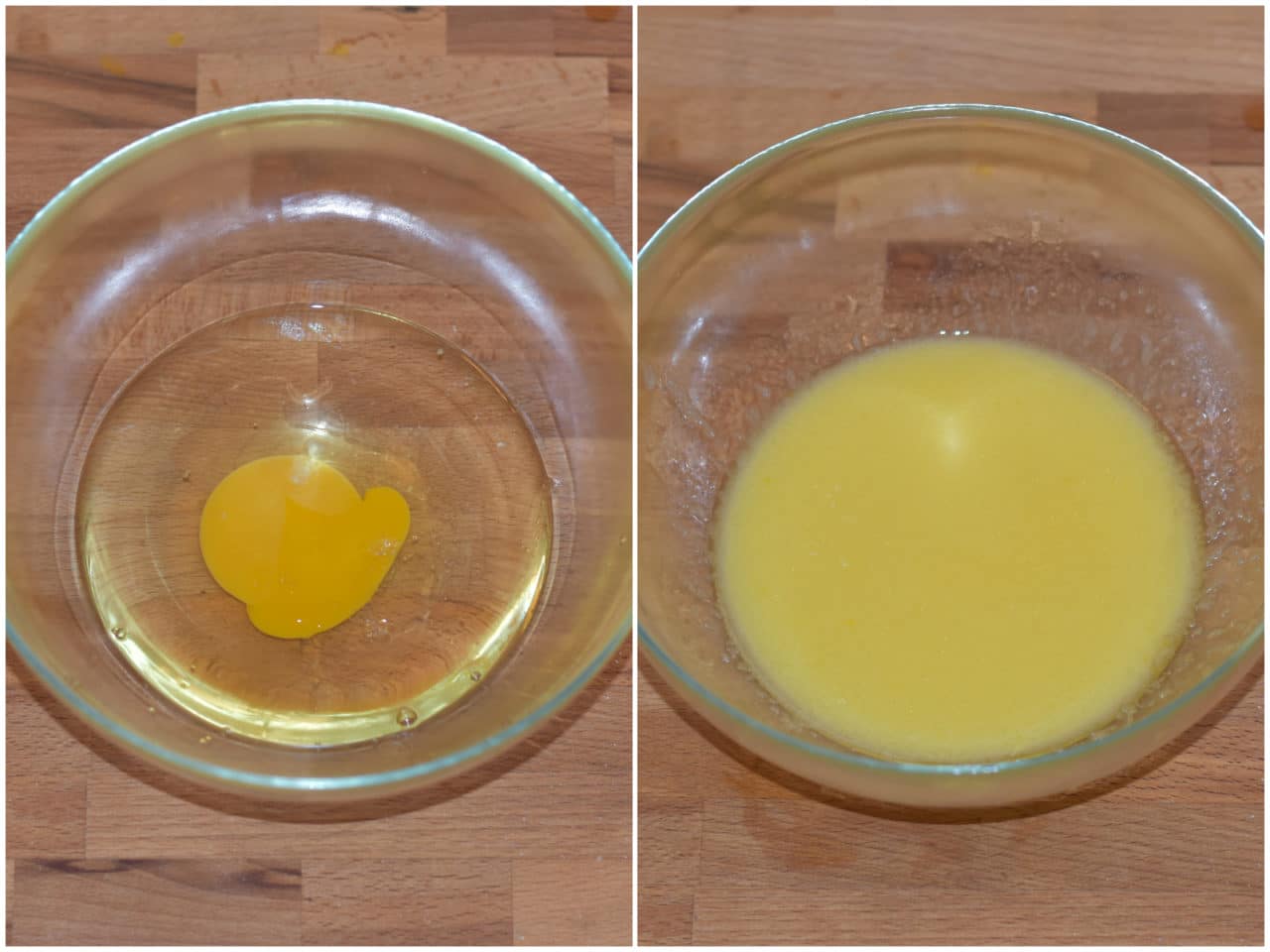 Versate gli ingredienti liquidi su quelli secchi e amalgamate velocemente.