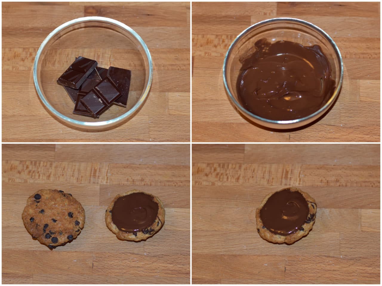 Sciogliete il cioccolato a pezzetti (in microonde o a bagnomaria) e, una volta completamente freddi, decorate solo il fondo di metà dei biscotti.