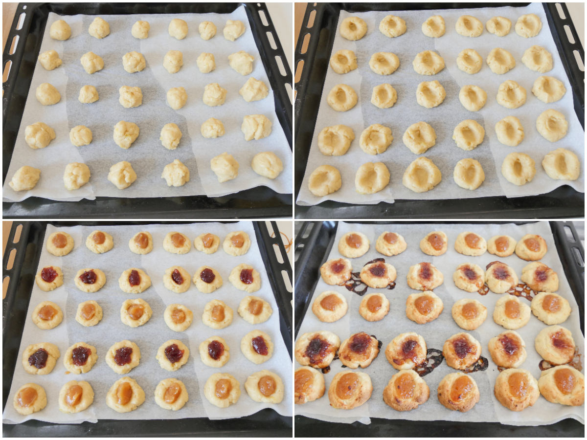 Riprendete l'impasto e dividetelo in palline, disponendole man mano sulla teglia rivestita di carta forno, quindi create una fossetta al centro (con un dito o il manico di un cucchiaio di legno) e riempitela con la marmellata.