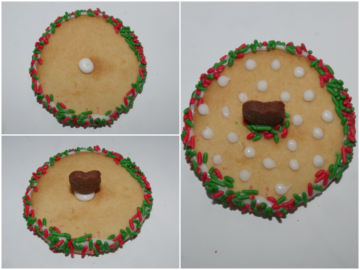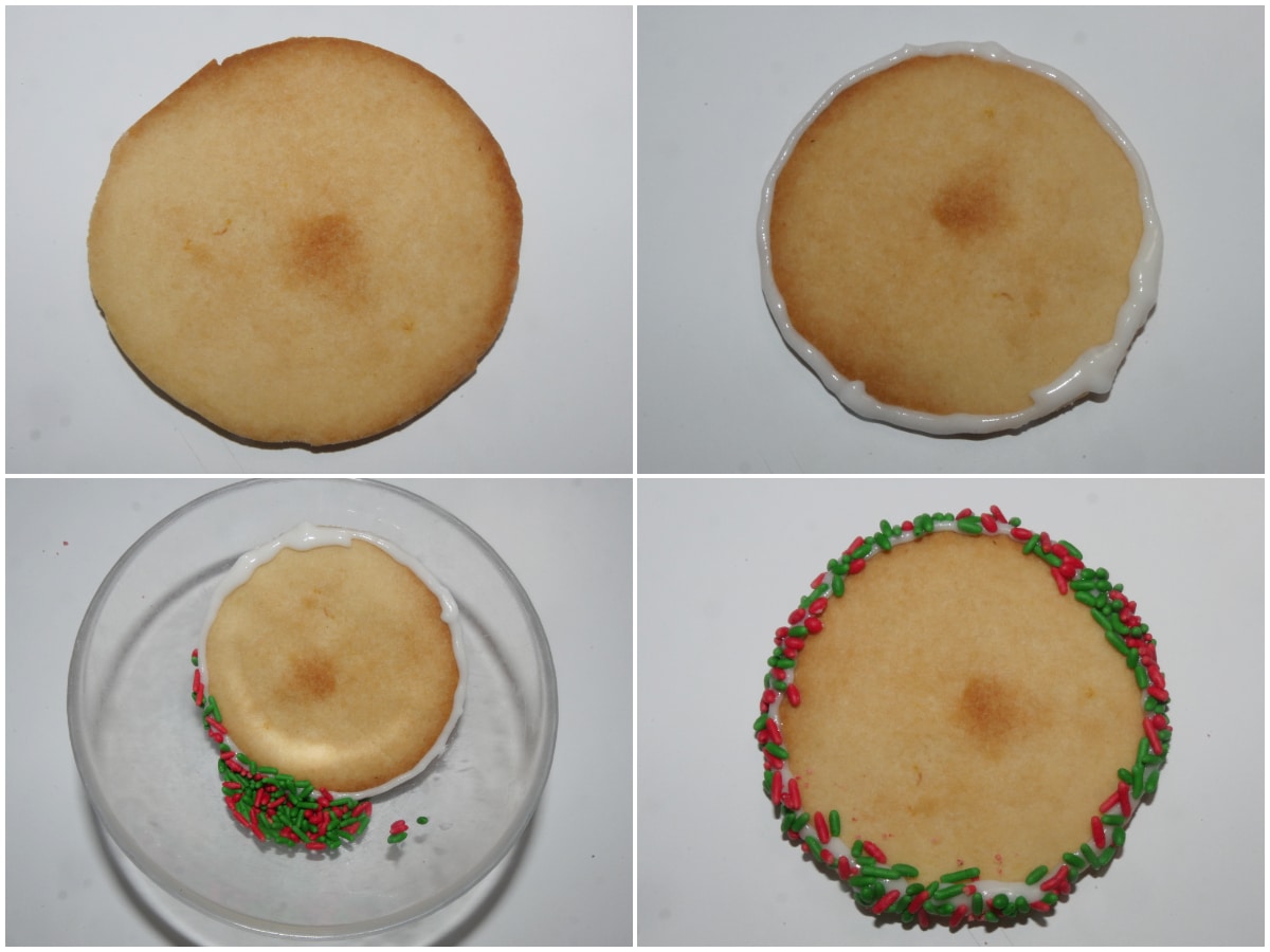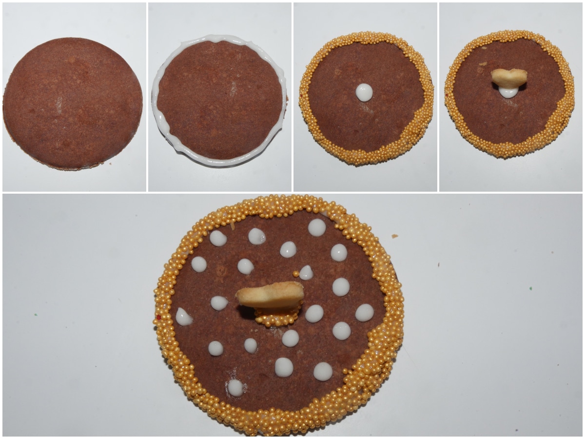 Aiutandovi con la glassa, decorate le basi dei copritazza con codette e zuccherini, lasciando libera la parte centrale per il manico.