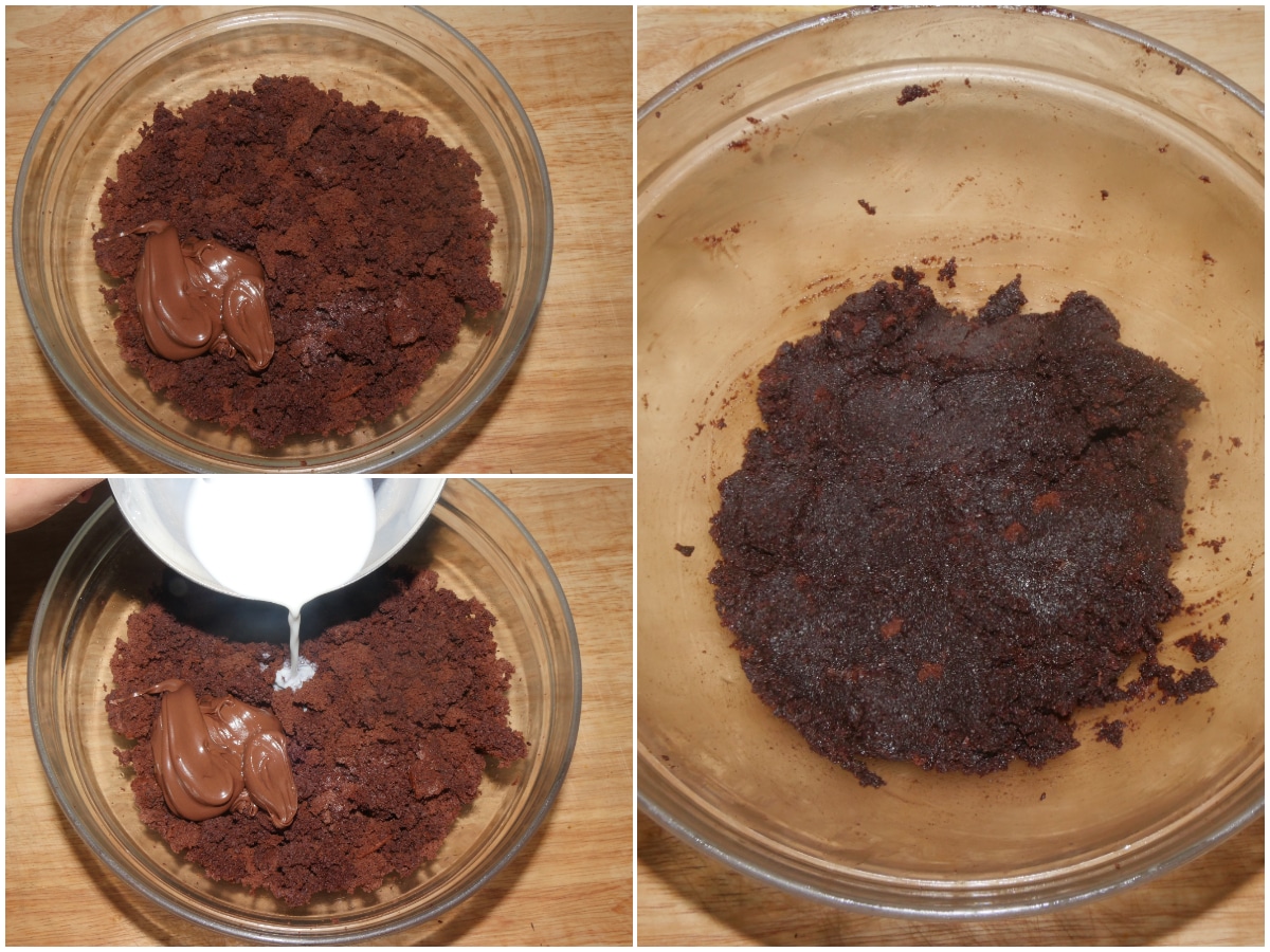 Unite in una ciotola pan di Spagna, Nutella, lievito e latte e amalgamate: dovreste ottenere un composto morbido ma lavorabile.