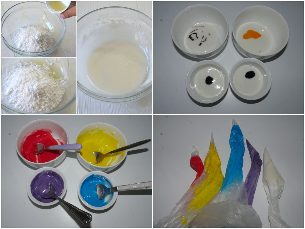 Nel frattempo che i biscotti si raffreddano, preparate la glassa mescolando nei vari bicchierini acqua e zucchero a velo e coloranti.