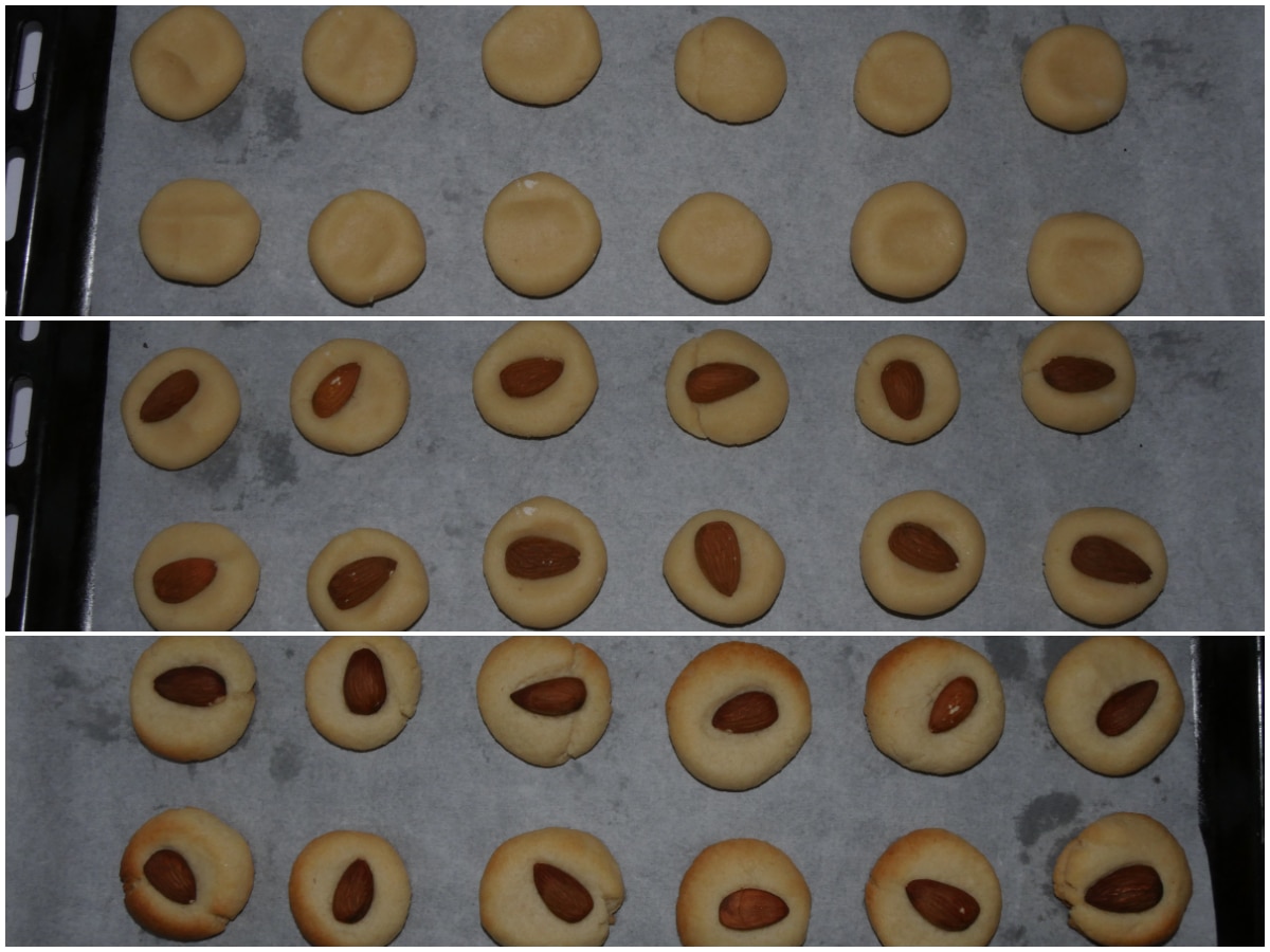 Disponete i biscotti sulla teglia del forno rivestita di carta forno, separandoli leggermente tra di loro, e disponete al centro di ogni biscotto una mandorla, cercando di incastonarla un po' nell'impasto.
