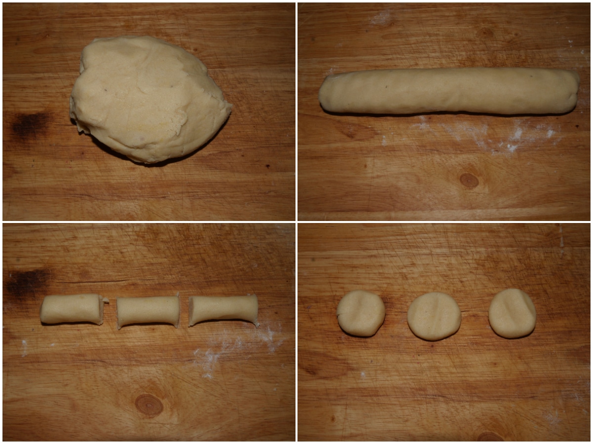 Sagomate il panetto per formare dei cordoncini spessi, tagliatene dei pezzetti uguali tra loro e sagomateli a formare delle palline grandi come una noce, quindi schiacciatele leggermente.
