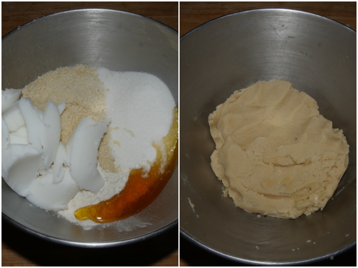 Mettete tutti gli ingredienti (meno le mandorle intere) in una ciotola e lavorate velocemente, fino ad ottenere un panetto omogeneo.