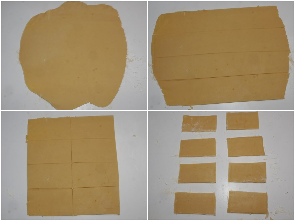 Riprendete la frolla e stendetela su di un piano di lavoro leggermente infarinato creando una sfoglia da circa 5 mm, quindi ritagliatela in rettangoli da circa 3-4 cm x 8-9 cm.