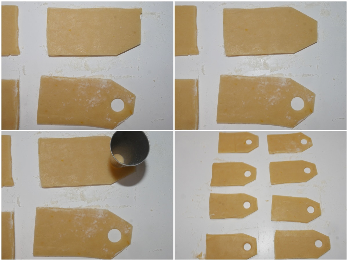 I biscotti etichetta di Natale sono un'idea assolutamente deliziosa: si tratta di normali frollini (io li ho fatti con la mia pasta frolla Milano, ma va bene una frolla qualsiasi), ma sagomati e decorati per ricordare le etichette dei pacchi regalo. Insomma, oltre ad essere simpatici da vedere e deliziosi da mangiare, potete anche sfruttarli come segnaposto per la tavola delle feste o addirittura come decorazione gastronomica per i vostri pacchetti sotto l'albero... Mi raccomando, ricordate di chiuderli in un sacchetto per alimenti e attenzione se per casa circolano bambini piccoli o animaletti domestici, o potreste trovarvi i pacchetti sguarniti di nome e qualcuno con un bel mal di pancia ;)