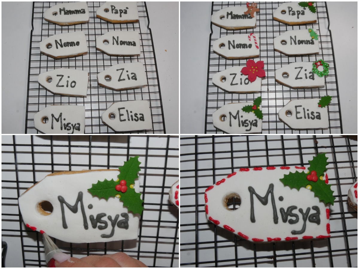 Usando una sac-a-poche dal beccuccio molto sottile completate le etichette, usando la glassa nera per le scritte e quella rossa per i decori, quindi con la rimanente glassa bianche attaccate i decori che avete scelto (codette, zuccherini, decorazioni di pasta di zucchero...).