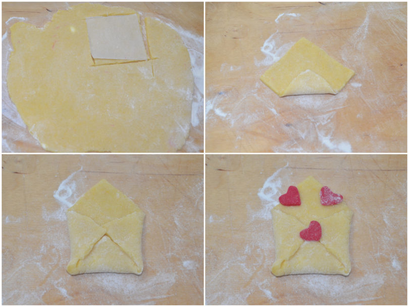 Ripiegate 3 angoli verso il centro per formare la busta da lettere. Quindi decorate con i cuoricini, spennellandone un lato con acqua per attaccarli.