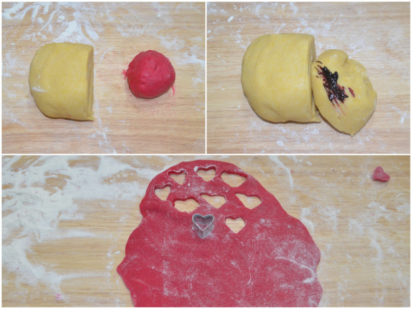 Stendete l’impasto fino ad ottenere uno spessore di mezzo cm e con uno stampo molto piccolo ricavate dei cuoricini.