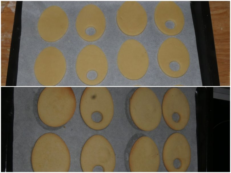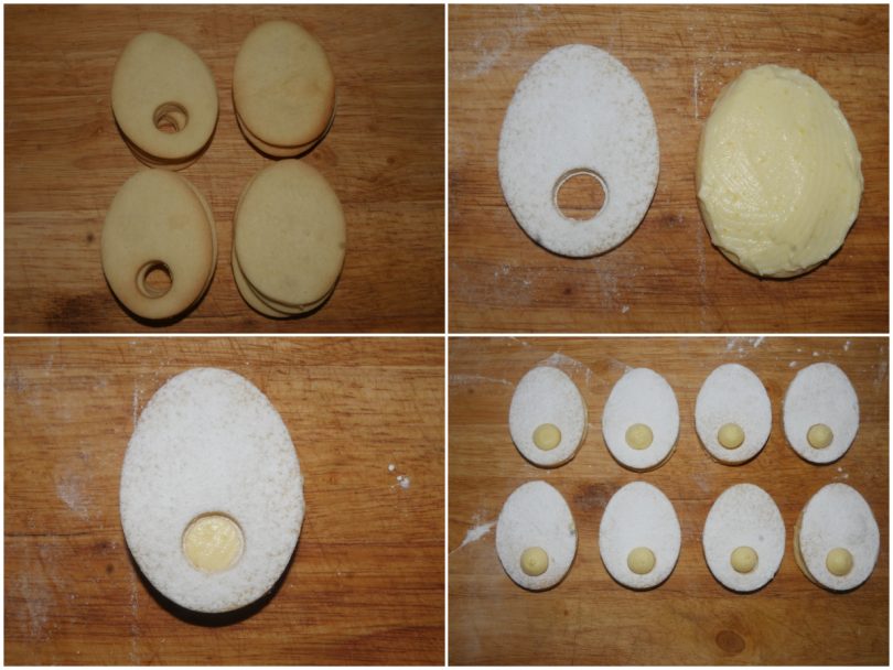 Riprendete la pasta frolla, stendetela in una sfoglia non troppo sottile e ricavate i biscotti con una forma a uovo da circa 8-10 cm: dovranno essere in numero pari, perché andranno poi accoppiate a 2 a 2.
