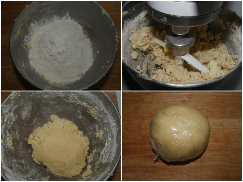 Infine aggiungete la farina e lavorate velocemente (l'impasto potrebbe sembrare un po' sbricioloso, ma è normale, non aggiungete altri liquidi a meno che non sia assolutamente necessario), quindi compattate con le mani fino a ottenere un panetto, rivestitelo con pellicola per alimenti e lasciate riposare in frigo per 1 ora.