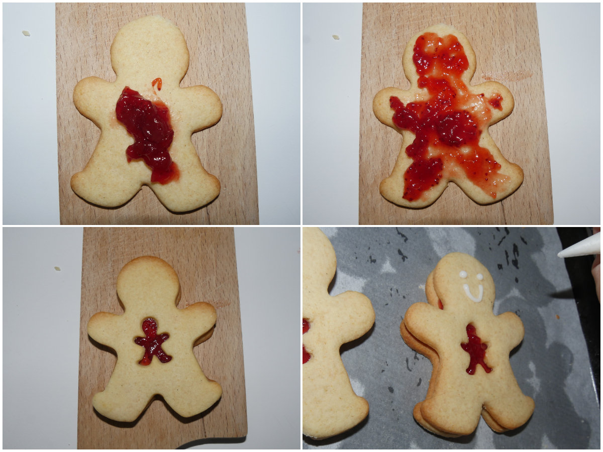 Farcite gli omini non intagliati con la marmellata, copriteli con gli omini intagliati , quindi create i decori che volete con un po' di ghiaccia.