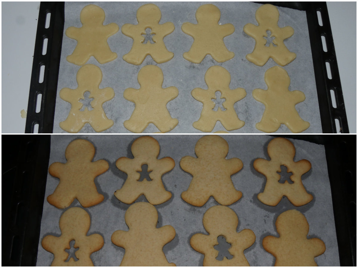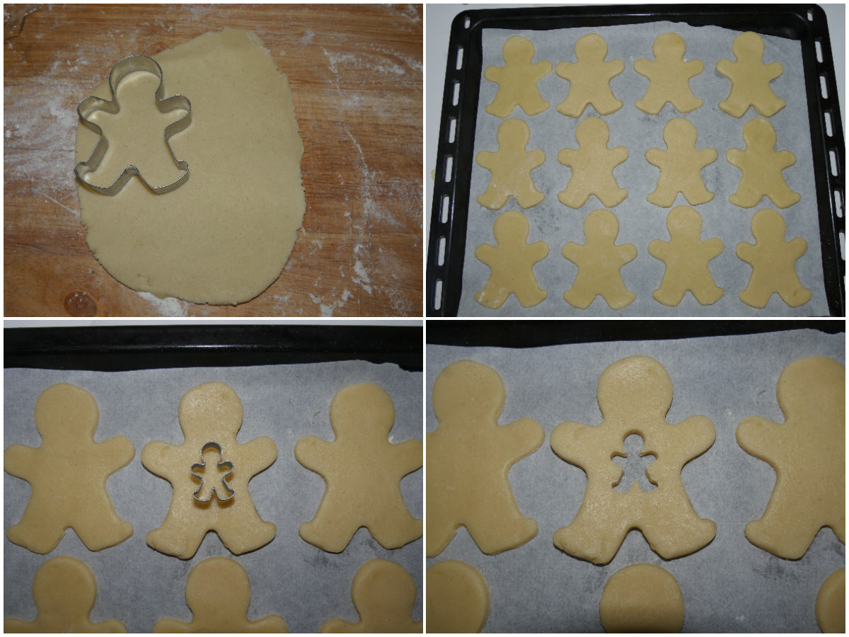 Posizionateli su una teglia rivestita di carta forno. Su metà delle formine intagliate, con un tagliabiscotti più piccino, un omino piccolo.