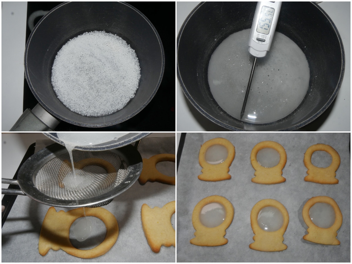 Quando i biscotti saranno ormai freddi occupatevi dell'isomalto: mettetelo in un pentolino e fatelo sciogliere a fiamma bassa (dovrà iniziare a diventare spumoso, o raggiungere i 155°C; potete scioglierlo anche in microonde, procedendo a intervalli di 10-20 secondi per volta).