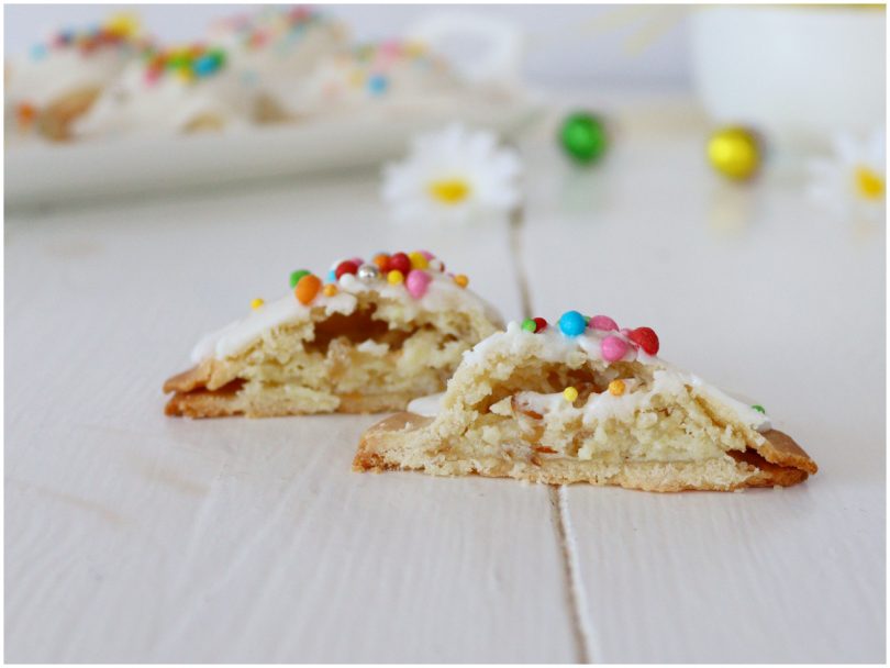 Praticamente piuttosto che farne 1 sola grande da servire tagliata a fette, si fanno dei fantastici cookies pastiera, con la classica frolla friabile all'esterno e un cuore dolcissimo ripieno di grano. Per dare un tocco ancora più festoso sono ricoperti da glassa e qualche zuccherino colorato, ma se preferite potete ometterlo... Secondo me sono deliziosi!