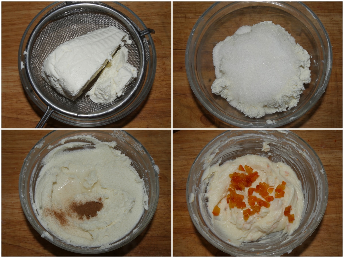 Preparate la farcitura: setacciate la ricotta, quindi sbattetela con le fruste insieme allo zucchero, infine incorporate con una spatola aromi e canditi.