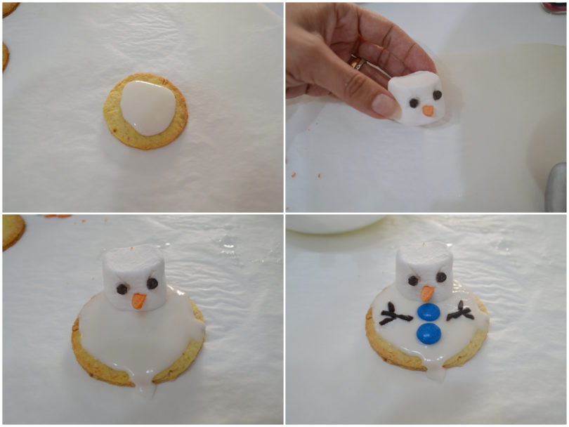 Aggiungete un marshmellow (pigiate un pochino per attaccarlo bene con la glassa al biscotto) che sarà la testa del pupazzo di neve, quindi aggiungete gli altri elementi del pupazzo: gocce di cioccolato per gli occhi, zuccherini arancioni per il naso, smarties per i bottoni, pezzetti di liquirizia per braccia e mani.