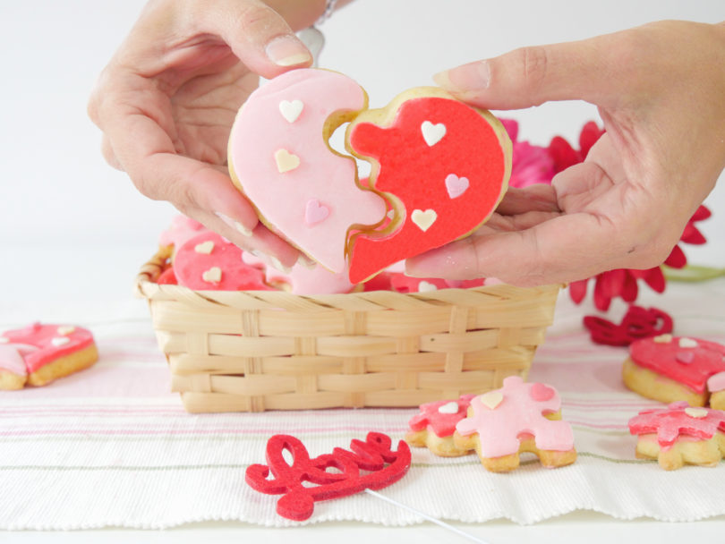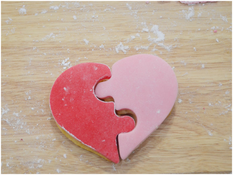 Con la glassa restante, attaccate i cuoricini di zucchero: quando la glassa sarà asciutta, i biscotti puzzle saranno pronti.