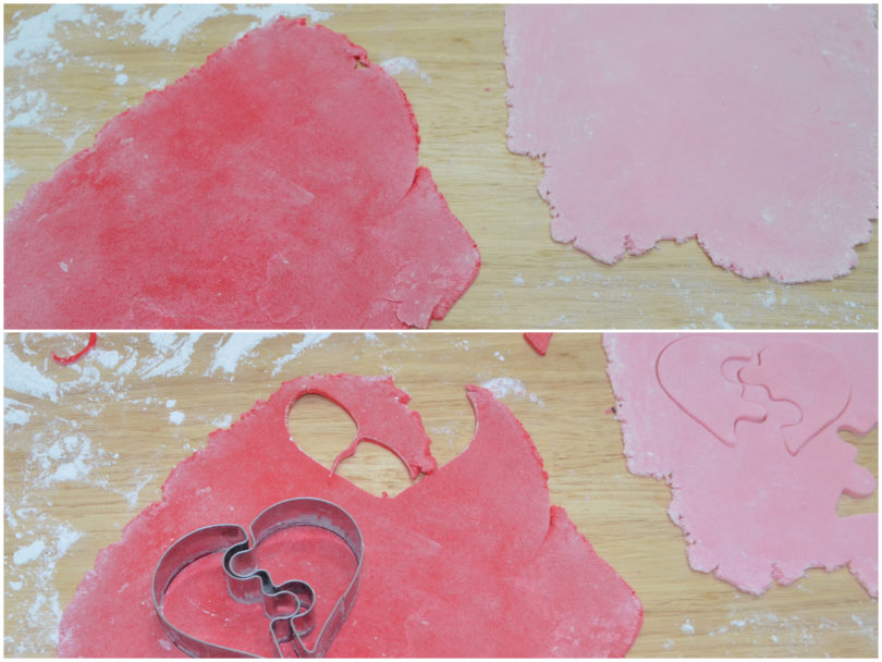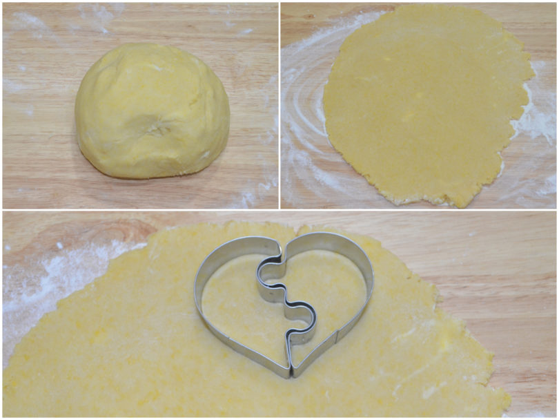 Riprendete la frolla, stendetela col matterello e ricavate i mezzi cuori ed i tasselli dei puzzle