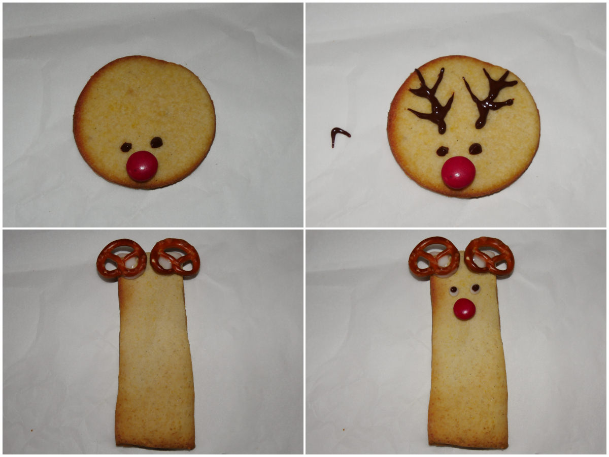 Per le formine più semplici, invece: ho creato il musino della renna, con tanto di corna, sempre con cioccolato e smarties su quelli tondi; per i biscotti rettangolari ho usato pretzel e smarties, attaccati con la ghiaccia reale, e ho creato poi gli occhietti con ghiaccia reale e cioccolato fuso.