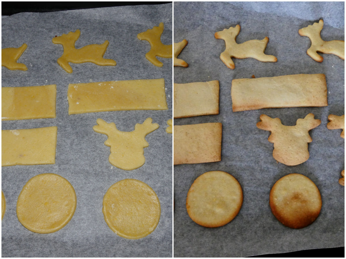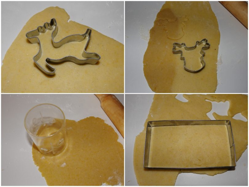Riprendete il panetto, stendetelo in una sfoglia alta circa 0,5 cm e ritagliatela con le vostre formine (io ho fatto cerchi, rettangoli, renne e teste di renna).