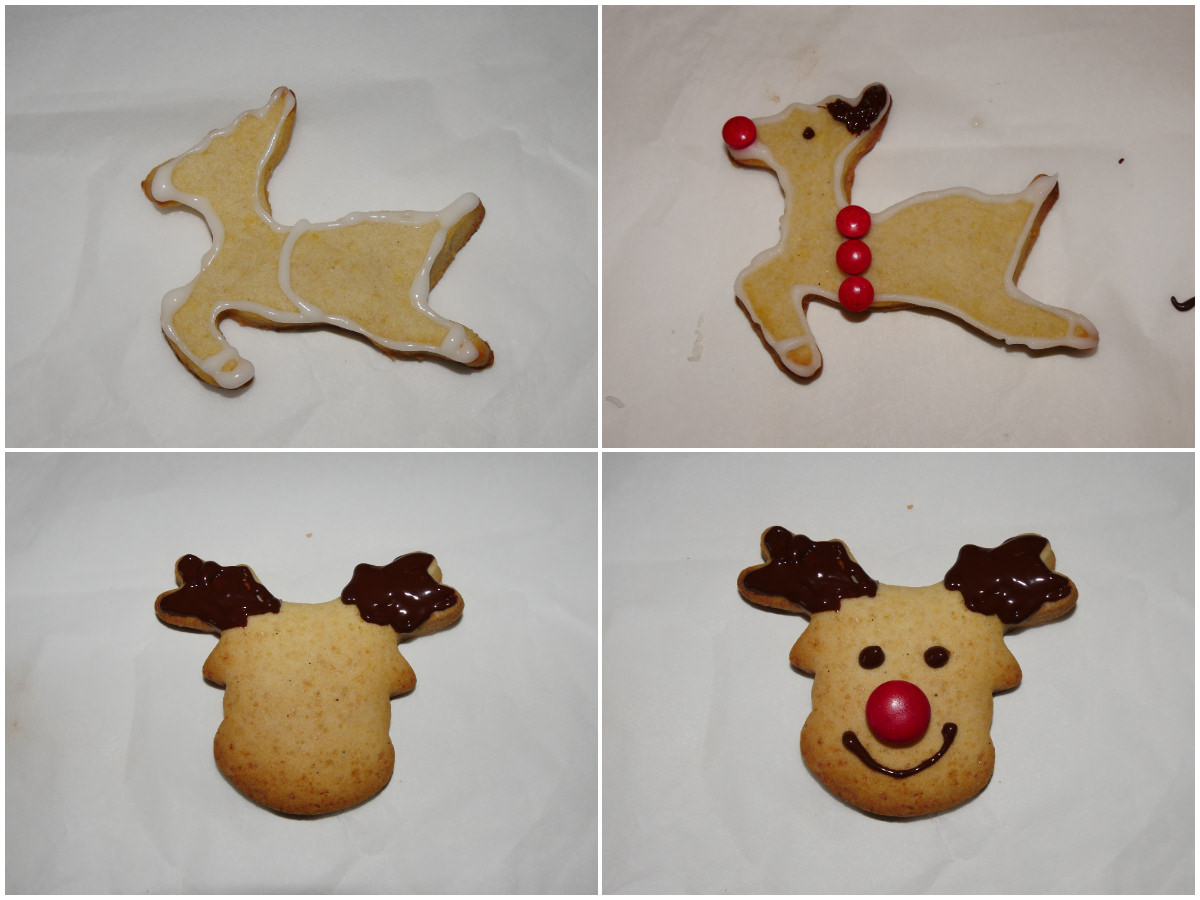 A questo punto potete procedere con la decorazione: per quanto riguarda me, ho decorato le renne con ghiaccia reale e mini smarties (colorando giusto occhietti e corna con il cioccolato fuso) e le teste di renna con cioccolato fuso, più un singolo smarties per il naso.