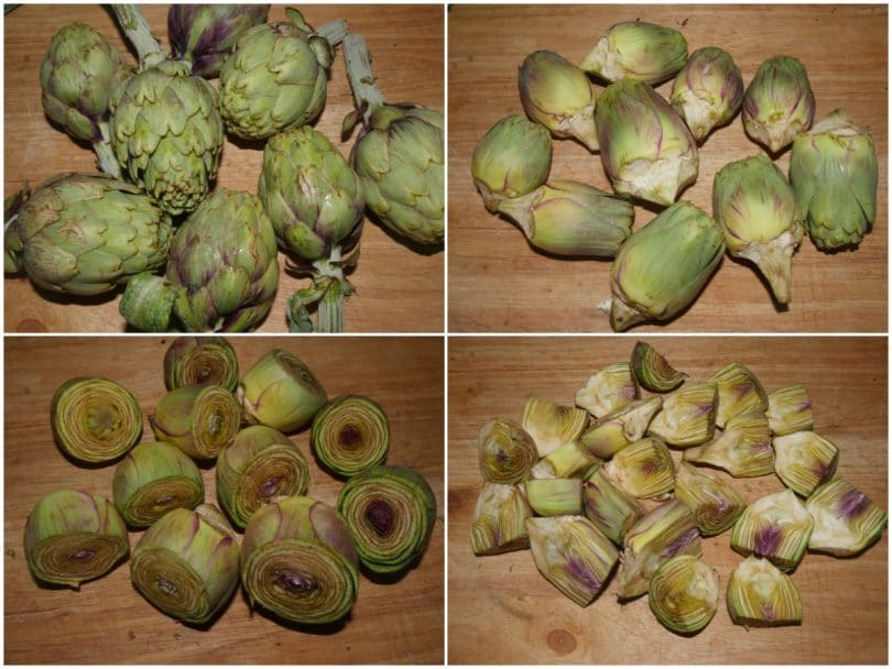 Pulire i carciofi poi tagliate i cuori in 4 parti