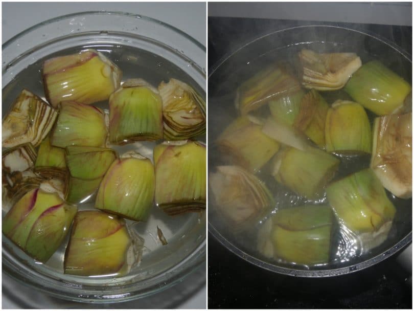 Mettete i cuori di carciofo in una ciotola con acqua e limone per una decina di minuti, poi sbollentateli in acqua salata per 5 minuti