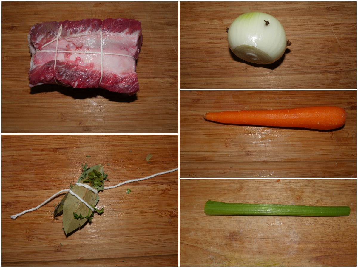 Innanzitutto predisponete gli ingredienti: legate la carne con spago da cucina come se fosse un arrosto (qui la guida per farlo al meglio), preparate un mazzetto con timo, alloro e prezzemolo e legatelo per bene con dell'altro spago da cucina, quindi mondate carota, sedano e cipolla e steccate quest'ultima con i chiodi di garofano (semplicemente infilandoli nella polpa).