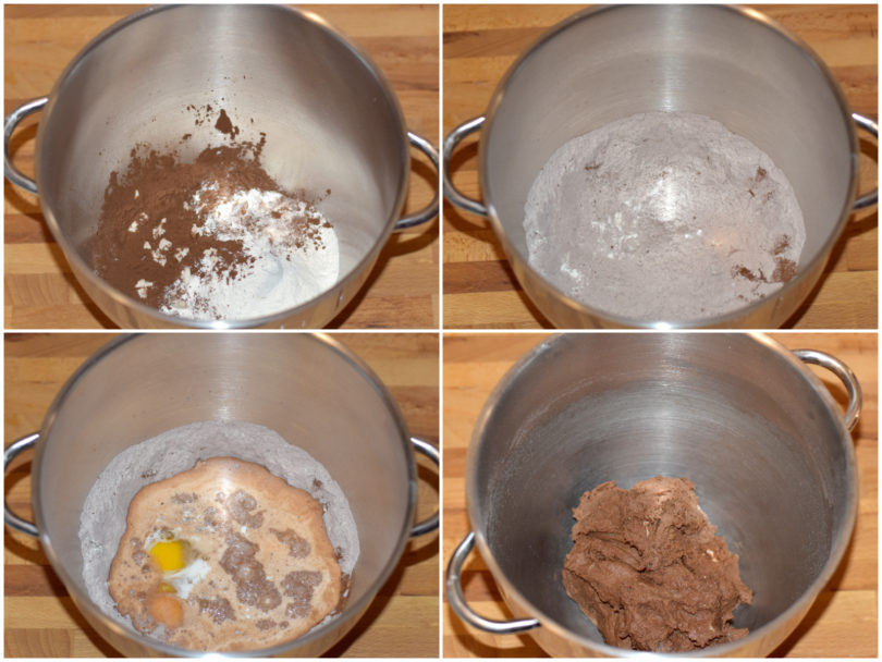 Unite in una ciotola farina, cacao e lievito sbriciolato e mescolate; ver5sate al centro uova, latte, zucchero e sale e lavorate fino ad ottenere un impasto omogeneo.
