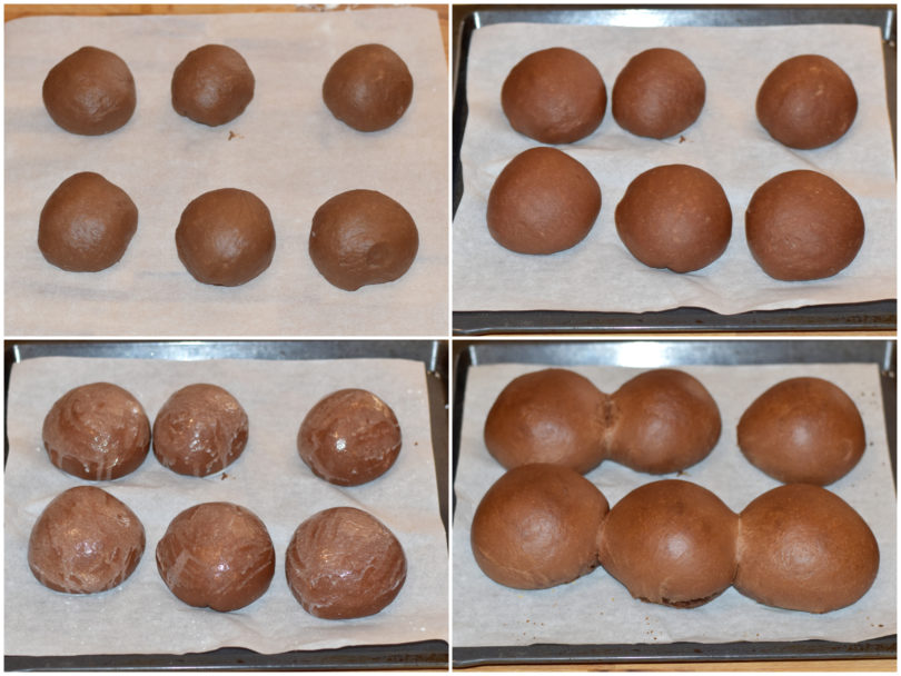 Disponete i panetti di impasto sulla teglia rivestita di carta forno, ben distanziate tra loro, copritele con pellicola per alimenti e lasciate lievitare ancora per circa 1 ora o fino al raddoppio del volume.