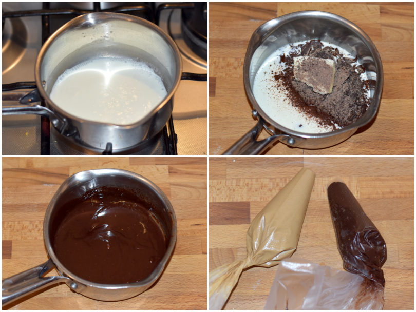 Mentre le brioche si raffreddano, preparate la ganache: scaldate la panna quasi fino all'ebollizione, quindi spegnete e versateci dentro cioccolato tritato grossolanamente e burro a pezzetti, mescolando fino ad ottenere una crema liscia, quindi lasciate raffreddare con pellicola a contatto.