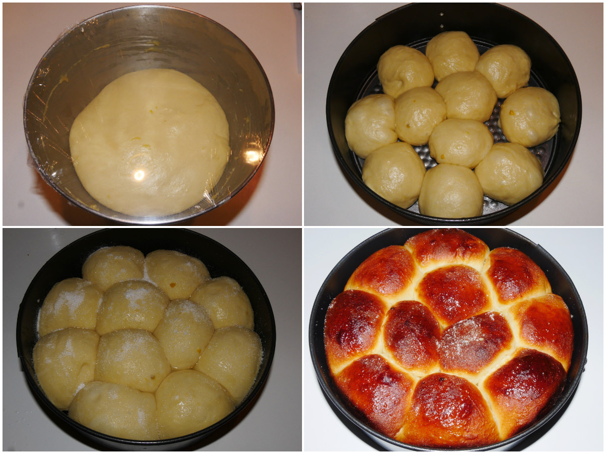 Riprendete l'impasto, dividetelo in 11 palline di peso uguale, distribuitele nello stampo imburrato e lasciate lievitare di nuovo fino al raddoppio (circa 1-2 ore).