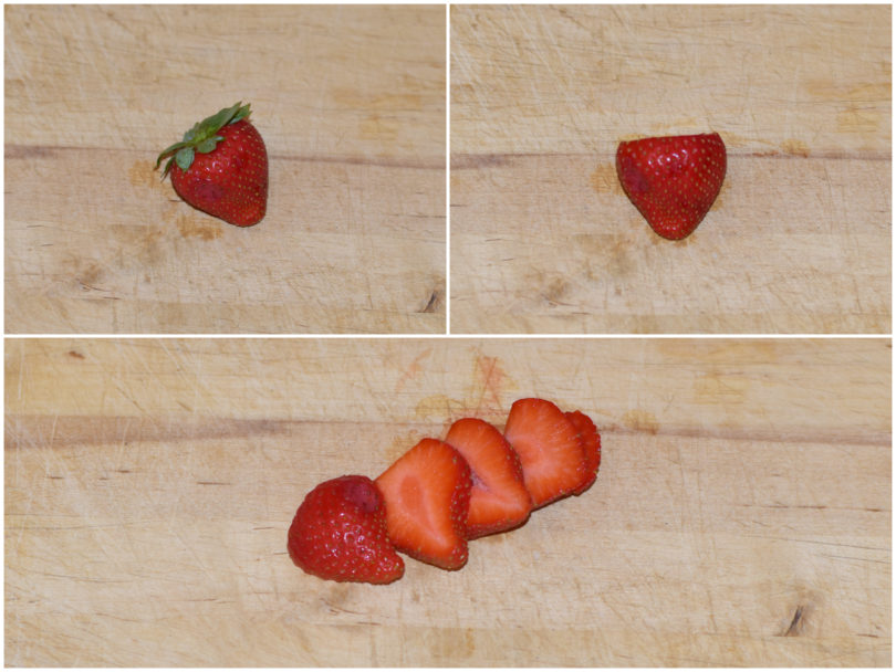 Mondate le fragole e tagliatele a fettine per il lungo, quindi usatele per decorare le brioche.