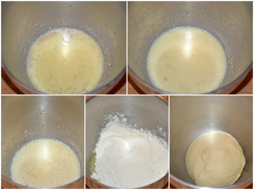 Unite in una ciotola latte, zucchero e lievito e mescolate fino a far sciogliere gli ultimi due, quindi incorporate olio, farina e sale e lasciate lievitare
