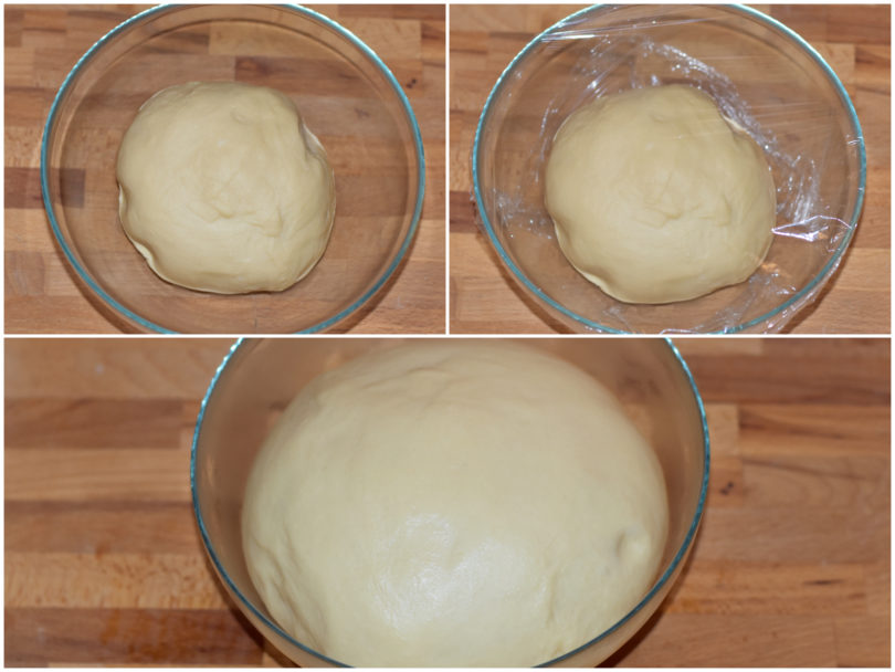 Coprite la ciotola con pellicola per alimenti e lasciate lievitare al caldo per almeno 3-4 ore o fino al raddoppio (in inverno può volerci anche tutta la notte).