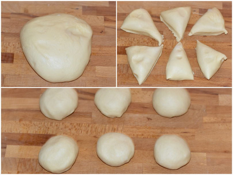 Sgonfiate l'impasto con le mani, dividetelo in 6 pezzi uguali e create delle palline, quindi lasciate lievitare nuovamente per almeno 1-2 ore o fino al raddoppio.