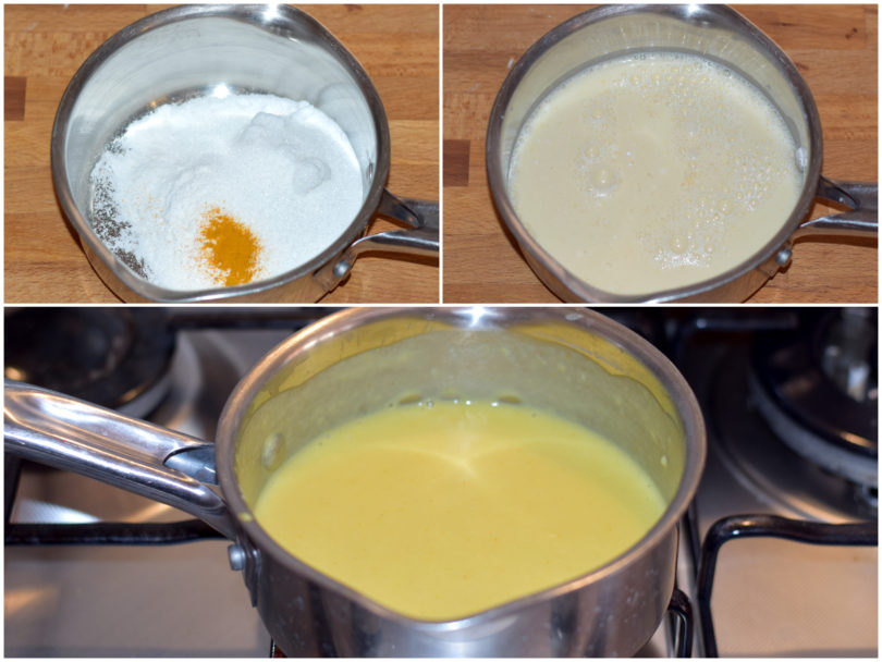 Nel frattempo preparate la crema pasticcera: mettete in un pentolino dal fondo spesso farina, zucchero e curcuma, quindi incorporate sale, vaniglia e latte vegetale.