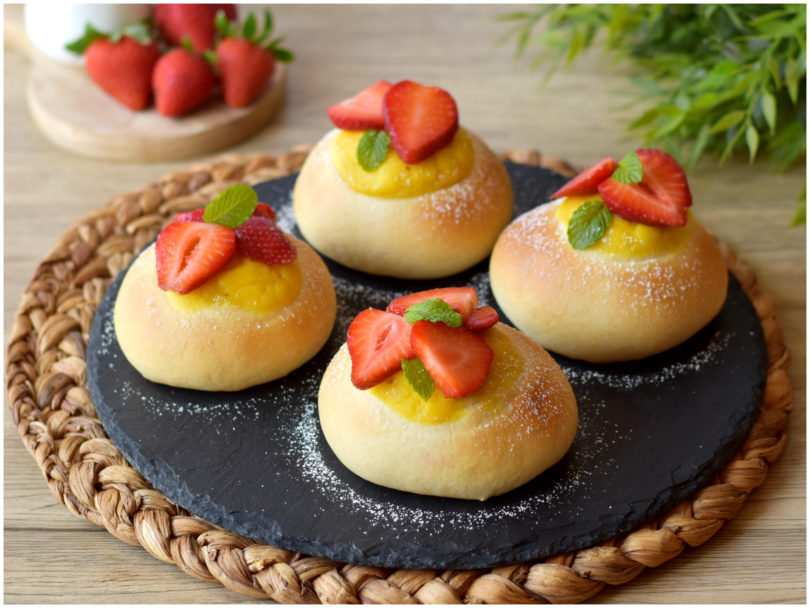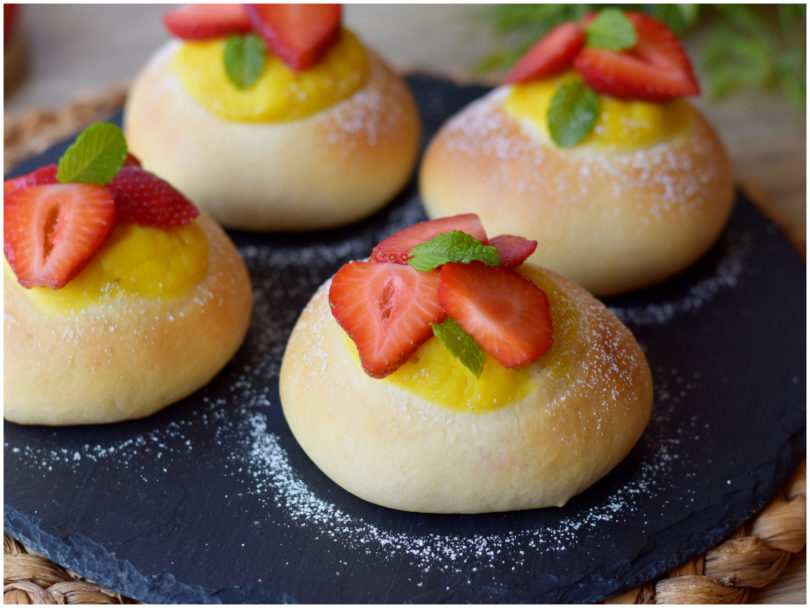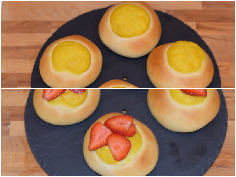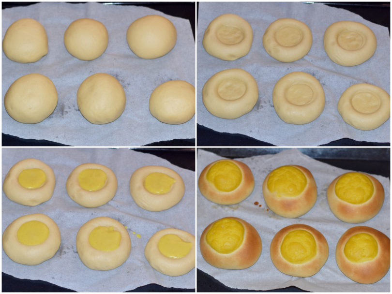 Una volta raddoppiate, riprendete le briochine, create un avvallamento al centro (ad esempio con il fondo di un bicchiere), aggiungete la crema al centro, spennellate l'impasto con del latte e cuocete per circa 30 minuti in forno statico preriscaldato a 180°C, quindi lasciate raffreddare completamente.