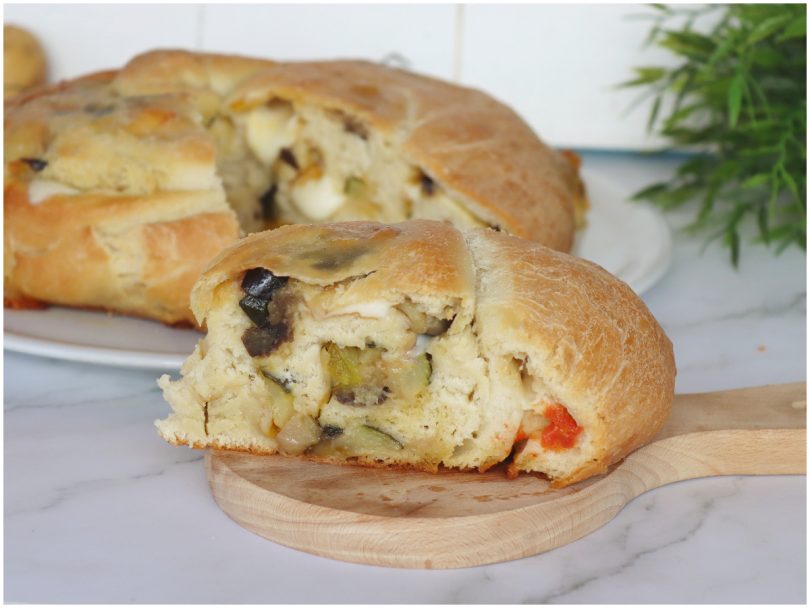 Lasciate intiepidire la brioche con le verdure, quindi tagliarla a fette e servire.