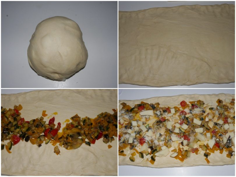 Disponete al centro di ogni rettangolo le verdure e i quadrotti di scamorza.