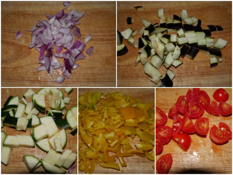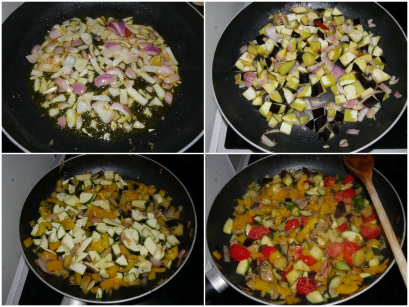 Poi Iniziate a far cuocere le cipolle con il peperoncino e l'olio. A cascata aggiungete melanzane, poi peperoni, zucchine e pomodorini e basilico in ultimo. Salate e lasciate raffreddare.