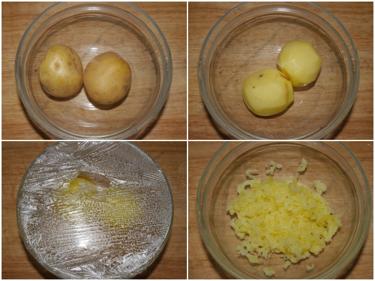 Innanzitutto lavate bene le patate, quindi bucherellatele, mettetele in una ciotola adatta al microonde, chiudete con pellicola per alimenti e cuocete per circa 5-6 minuti o finché non risulteranno cotte, quindi pelatele e schiacciatele con uno schiacciapatate o un passaverdure.
